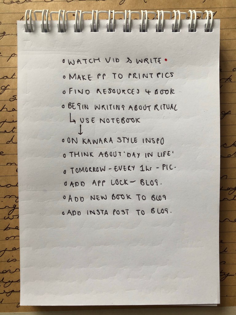 All of my notes and a little reflective piece about what I got from the video Some more planning and drafting ideas for some practical work tomorrow I started collecting some old resources to begin making my small book tomorrow about “routine and ritual”Some more old resources which I am very happy to be making use of in my current project.