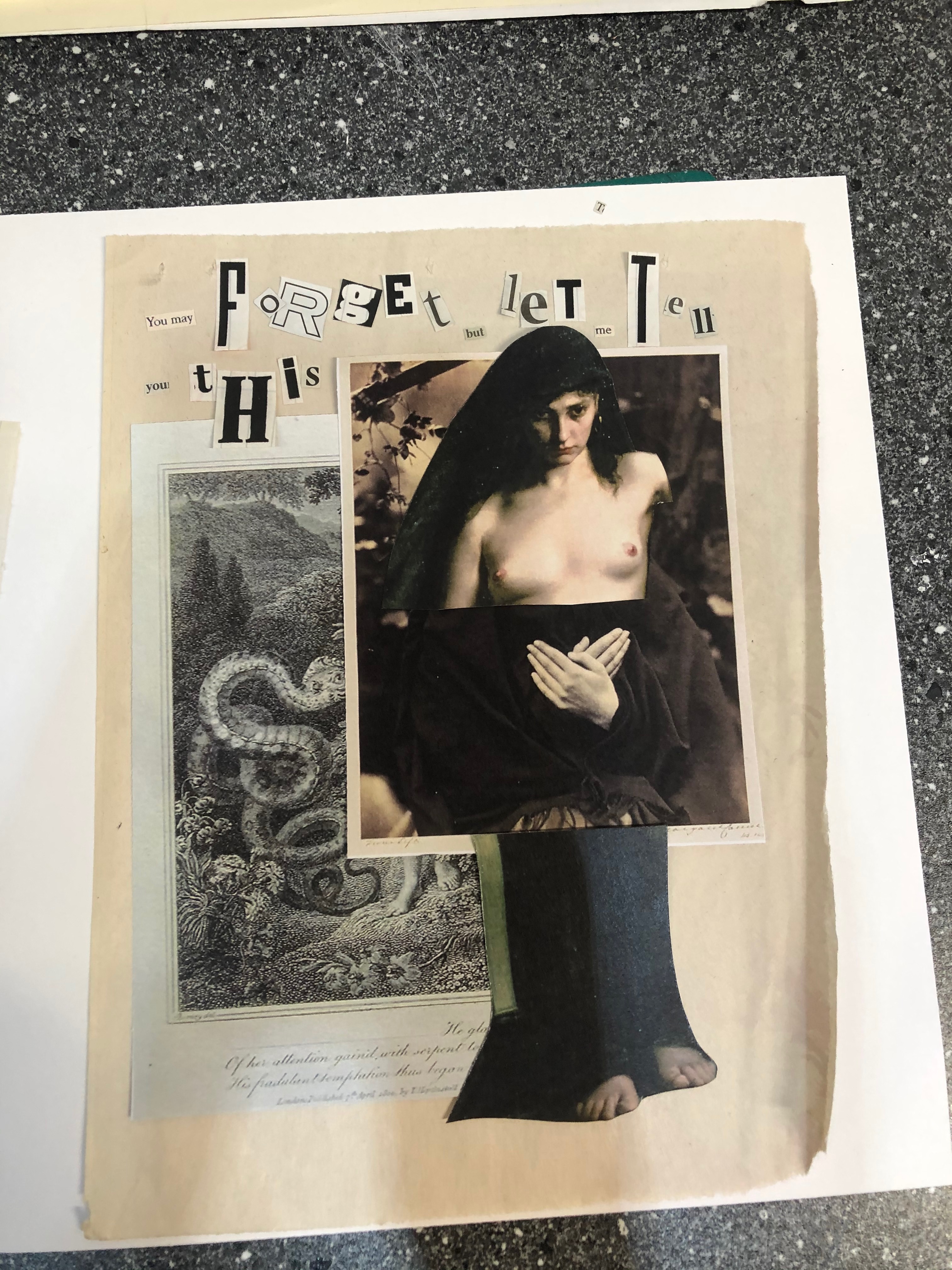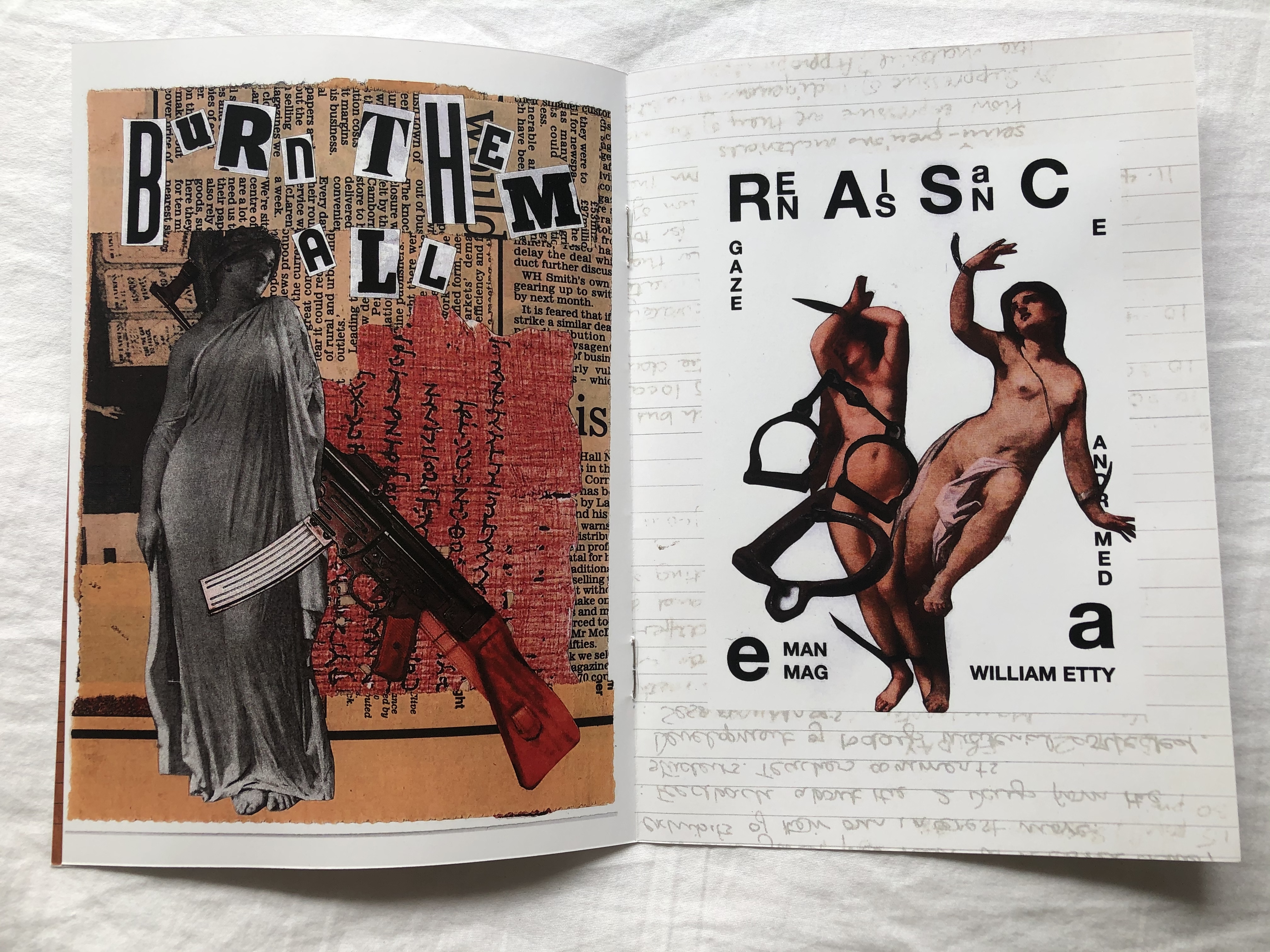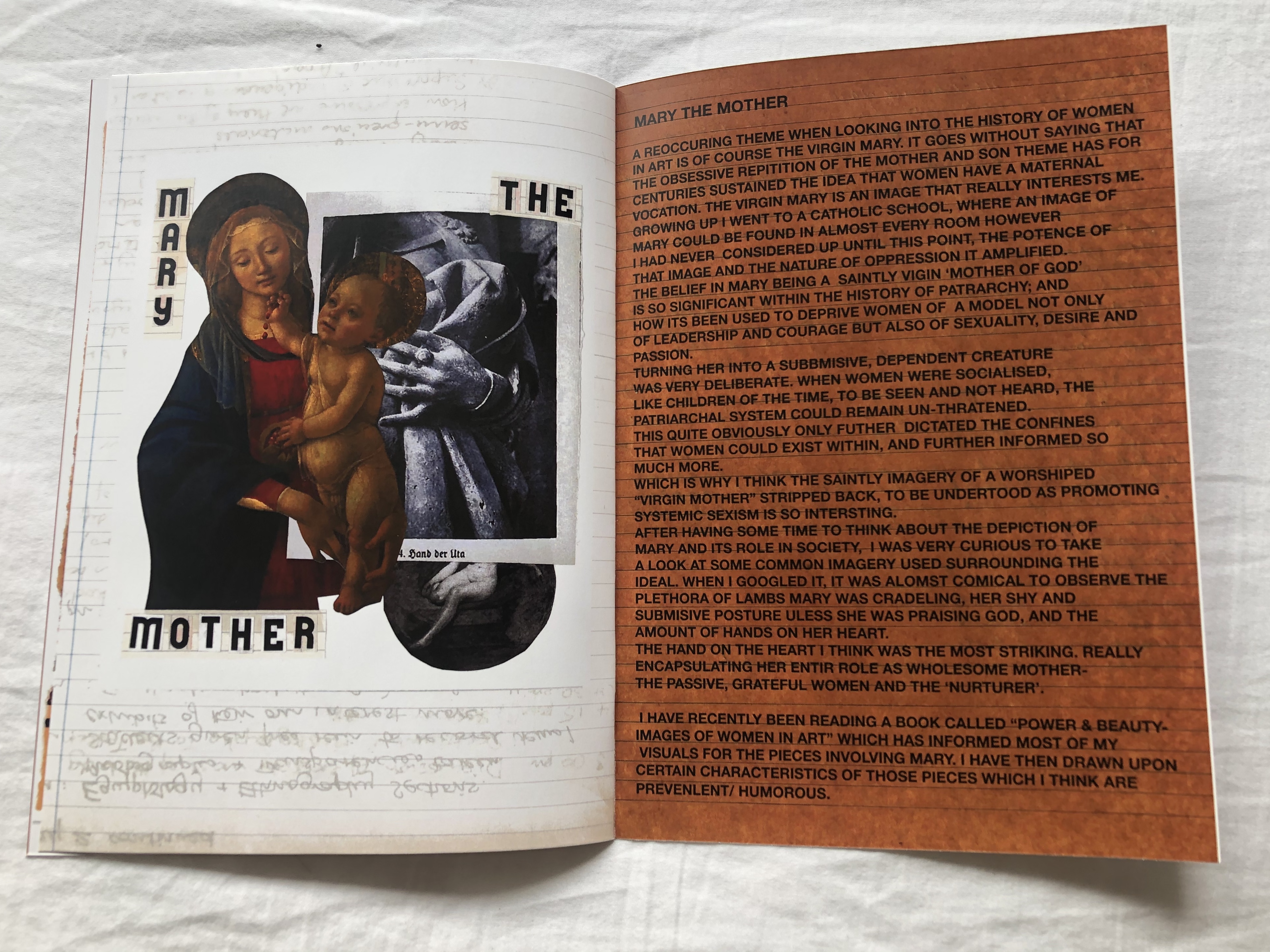 I had no idea how to use photoshop let alone in-design, however with the help of my friends and youtube, somehow (I still have no idea how) I managed to create the whole thing digitally. Scanning in my collages at a high resolution, editing them and then creating my zine- page by page. This is one of my biggest achievements because when I started college one of my goals was to learn how to use photoshop and it was getting to the point that I didn’t think it would ever happen. Now I realise I just needed to challenge myself and I could have done it all along. That taught me a lot about reaching goals and stretching out of my comfort zone in order to expand my skill set.