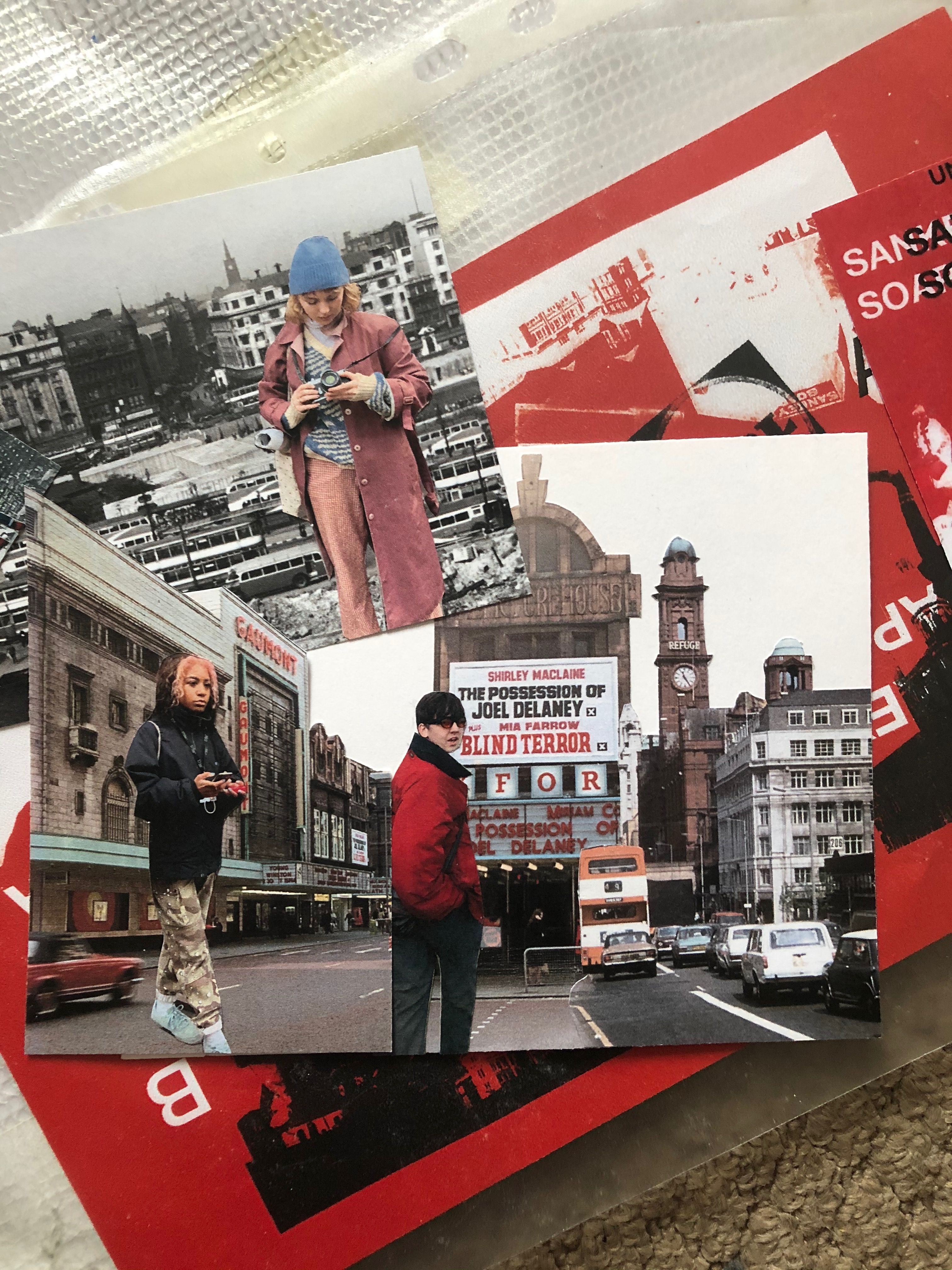This consisted of me taking images of my friends, buildings and scenes in Manchester- creating collages with them (on paper)& scanning those collages in. Experimenting with the printer in inverting colours, messing around printing on acetate & photocopying different colours/ sections ontop of each eachother.