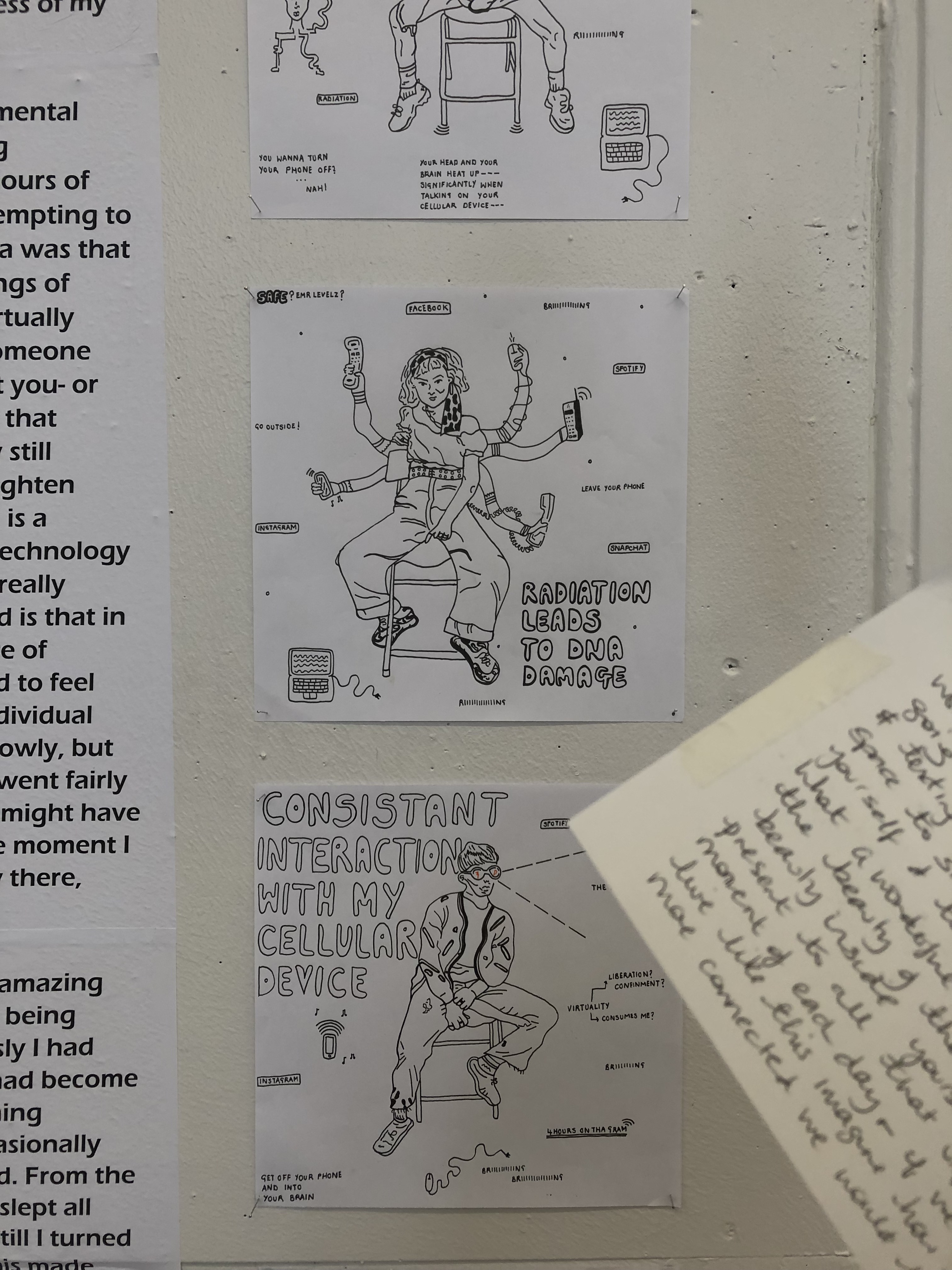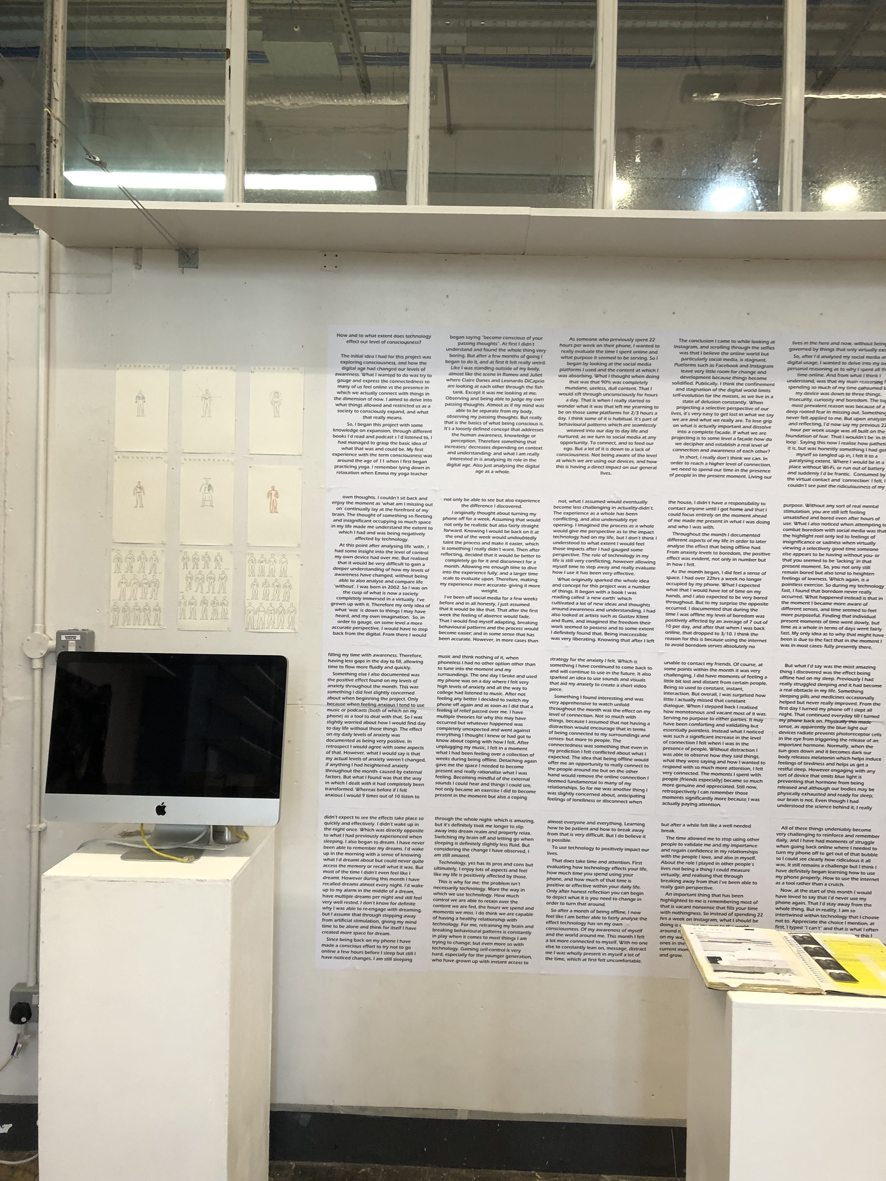I also wrote a long analysis of different aspects of my life and how I’d found being offline affected those. This was exhibited on the wall. From anxiety levels to my dream cycle, this document was very thorough and helped me feel very consolidated and accomplished in how I’d used my project to inform and educate me.