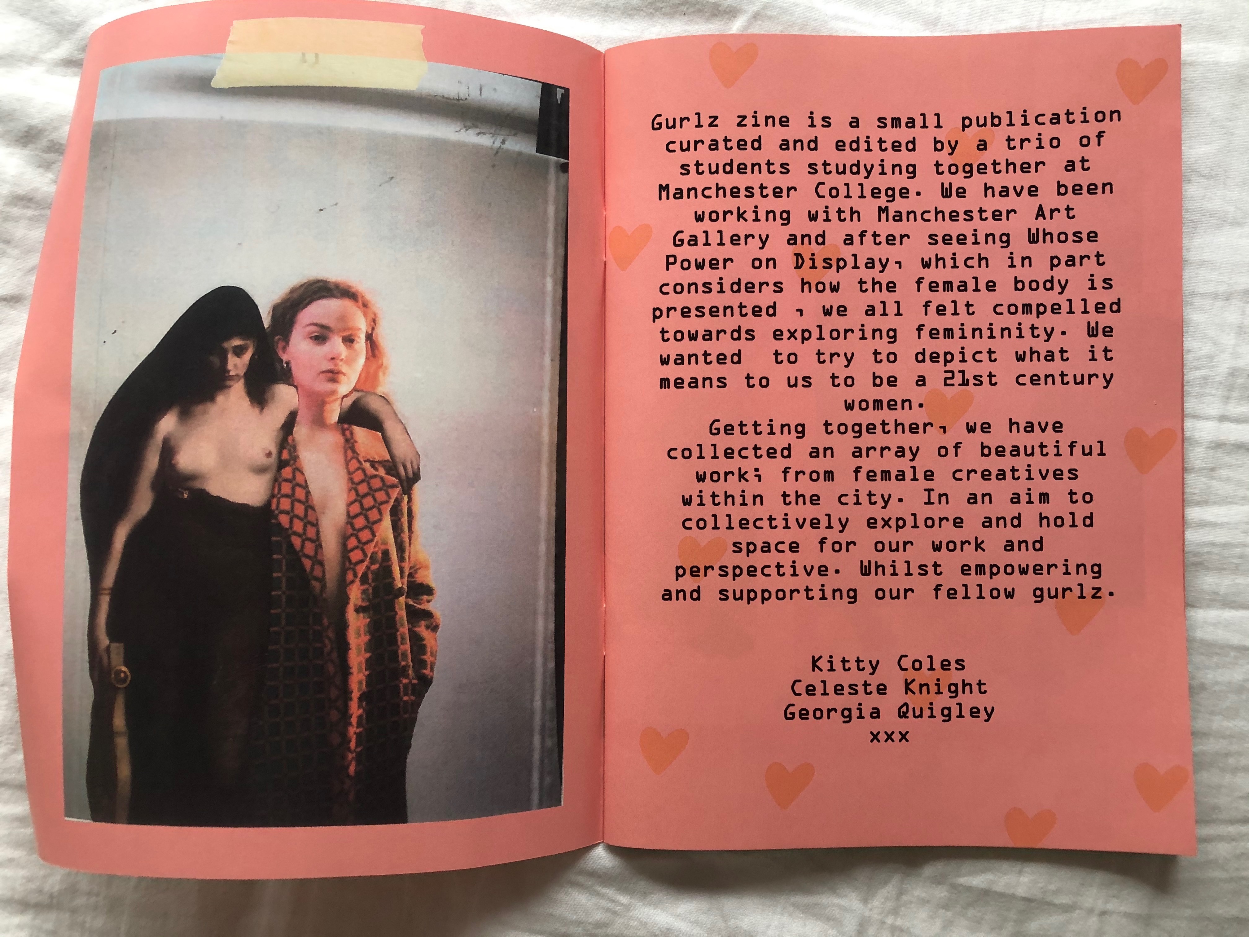 ‘Gurlz Gurlz Gurlz’ is the zine me and two other people on my course were approached about creating by The Manchester Art Gallery, in conjunction with a project they were doing with our college called ‘Future Creatives’. They gave us a very brief project idea which was essentially creating a zine. Everything else was essentially up to us. This project was created with the intention of giving young female creatives a space to exhibit there work and their voice. We took to social media to advertise entries and after a few weeks, our little team of three had a meeting, deciding which works we wanted to include.