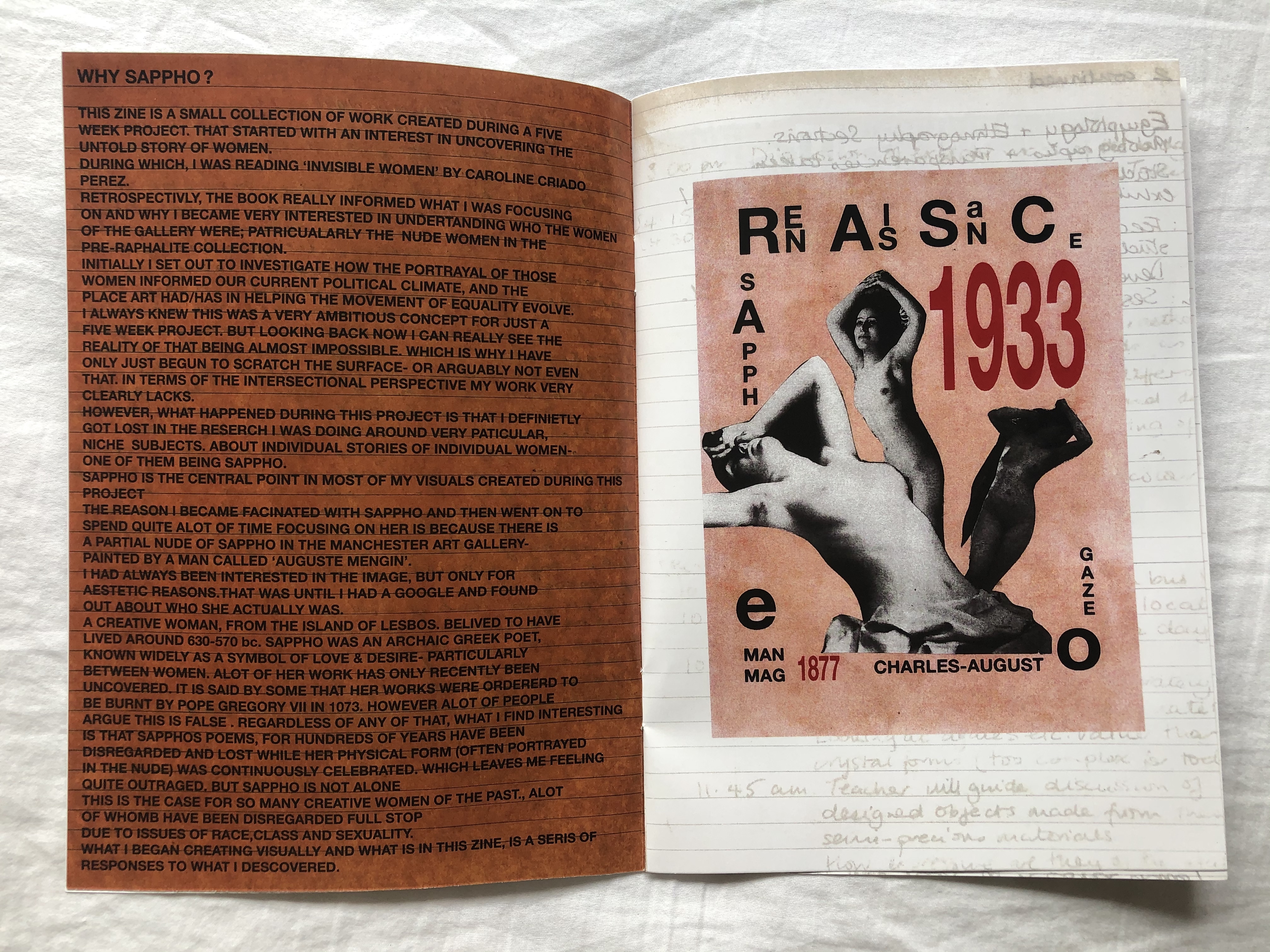 The last project I was able to do in college (before covid) was fortunately my favourite so far. In this project I was inspired to uncover some of the hidden history of women within the arts; after reading the book ‘invisible women’ which had been gifted to me several months before, and bringing into focus my favourite painting in The Manchester Art gallery- ‘Sappho’ by Augustine Mengin. The reason that painting inspired me to begin my project was because after admiring her form I realised that Sappho was more than a nude painted by a man. After doing some research into Sappho, I began to learn who she was and the ground breaking things she had done.
