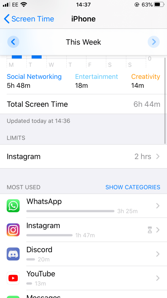 At the moment- all of my apps are locked from 11pm at night to 11am in the morning. I started doing this because I realised that having my phone just before I go to sleep and as soon as I wake up is not something I want for myself. I know, as I did an extended social experiment/ study on my own relationship with the phone for last years FMP. However during quarantine, it was becoming quite challenging to not be glued to my phone. Particularly Instagram. Which provided entertainment, socialising and endless scrolls.